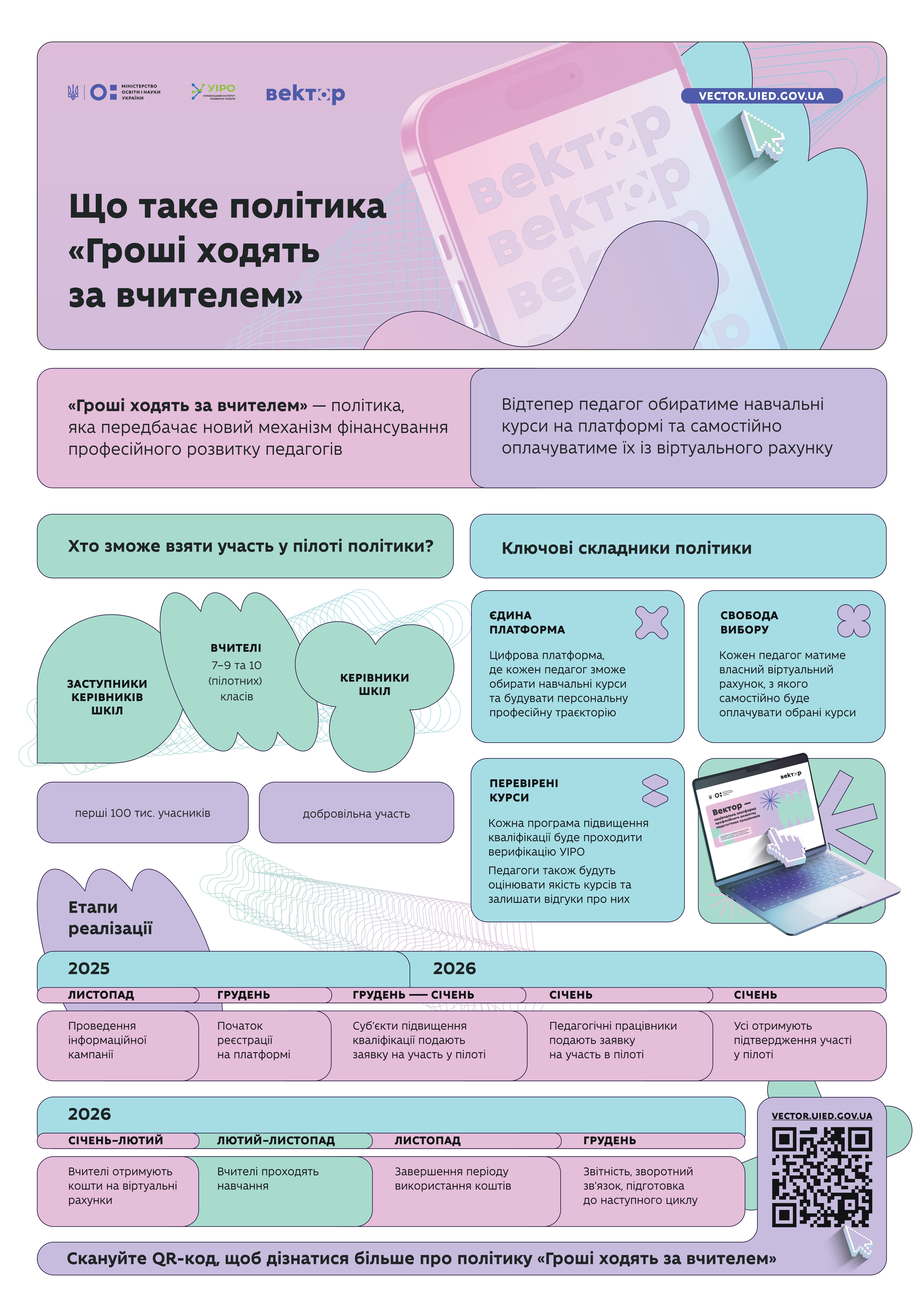 У межах політики держава нараховує 1500 грн безпосередньо педагогові на віртуальний рахунок для самостійного вибору програм підвищення кваліфікації відповідно до власних професійних потреб. Подання заявок і участь у пілоті відбувається через державну платформу «Вектор».